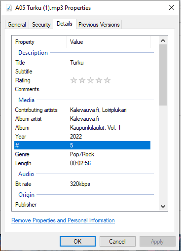 Kun olet hankkinut musiikin laillisista lähteistä ja sinulla on tallessa kuitti ja/tai artistin lupalappu (ks. yllä), varmista vielä, että kappaleissa on metatiedot kunnossa. Huom: me emme hyväksy musiikkikantaan sellaista musiikkia, jossa biisin metatiedot eivät ole kohdillaan. Eli varmin tapa saada musiikki läpi musakantaan on varmistaa vielä tiedostokohtaisesti, että ne sisältävät kaikki tarvittavat metatiedot. Klikkaa tiedostoa hiiren oikealla näppäimellä ja valitse Properties tai Ominaisuudet. Hakeudu välilehdelle Details: